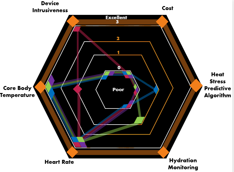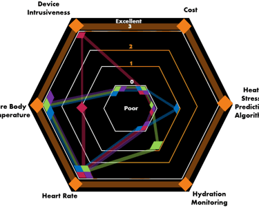 The monitor tracks core body temperature, heart rate, and hydration levels. Hydration is assessed using an optical infrared sensor that detects water content in the skin’s dermis. These three biomarkers are processed by a predictive algorithm that triggers alerts when the individual nears a heat stress threshold.